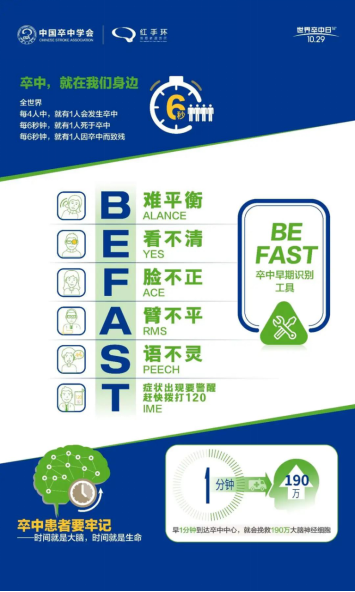 “BE FAST”的中文意思是“要快”,体现了脑卒中救治的时效性。前五个字母分别对应脑卒中一种识别症状:
