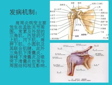 肩周炎病变主要发生在盂肱关节,并累及肩关节周围肌肉,是肌腱及滑囊等软组织的慢性炎症,导致肩关节周围疼痛及活动受限,形成关节内外粘连阻碍肩的活动。