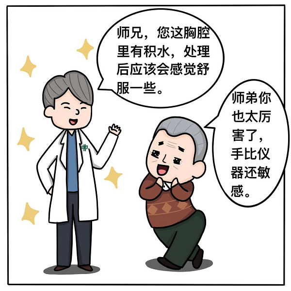 首次见面,“师弟”刘主任便露了一手,让我不得不服。触诊的时候,他发现我有胸腔积水的问题。我心里可疑惑了,之前在那么多医院用各种高级的设备都没有检查出积水,就凭触诊,还能检查出仪器都没发现的问题?