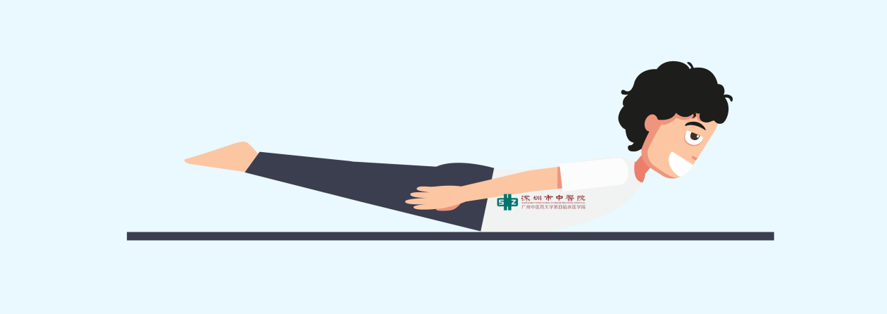 患者俯卧位,去枕,双下肢伸直,两手贴在身体两旁,下半身不动,抬头时上半身向后背伸,持续3至5秒,然后肌肉放松休息3至5秒为一个周期。每日3组,每组做10次。逐渐增加为抬头上半身后伸与双下肢直腿后伸同时进行。腰部尽量背伸形似飞燕,每日5至10组,每组20次。