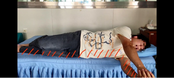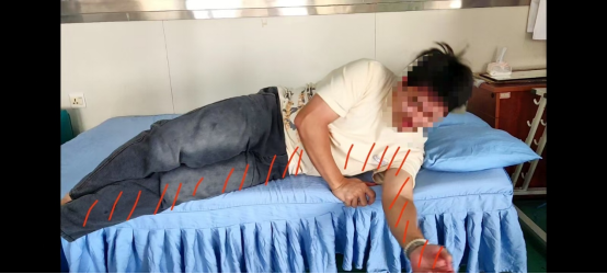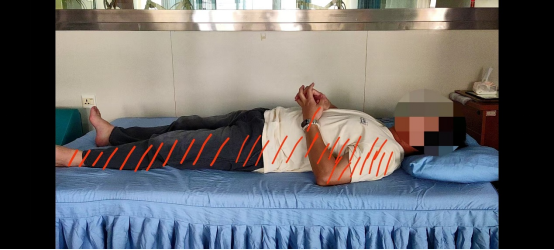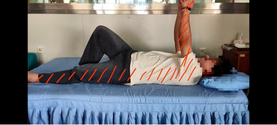 (1)患者仰卧位,健侧足从患侧腘窝处插入,并沿患侧小腿下滑至跟健,使健足置于患足下方;