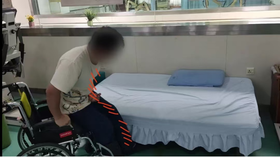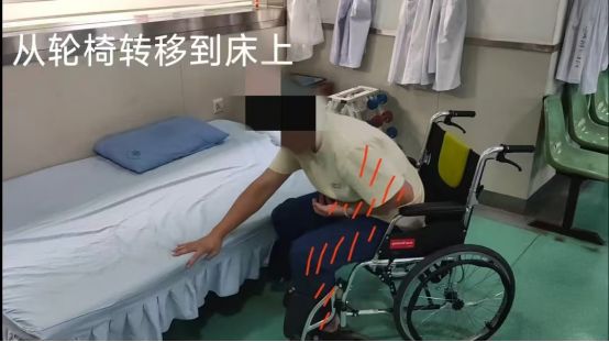 (2)患者在轮椅中先将臀部向前移动,健手支撑床面,同时抬起臀部向前;