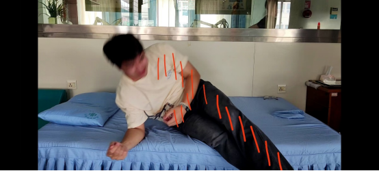 (2)健侧上肢向前横过身体,同时旋转躯干,健手在患侧推床以支撑上身,并摆动双腿,完成床边坐位;