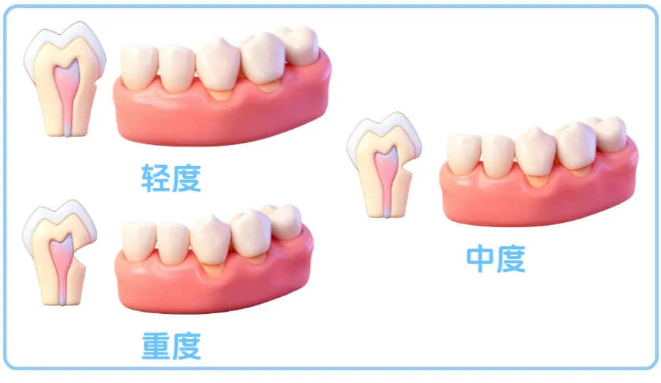 超过2mm,缺损深达牙髓腔,可出现自发性疼痛、咬合痛,甚至牙齿横向折断,常伴有牙龈萎缩、牙根暴露。