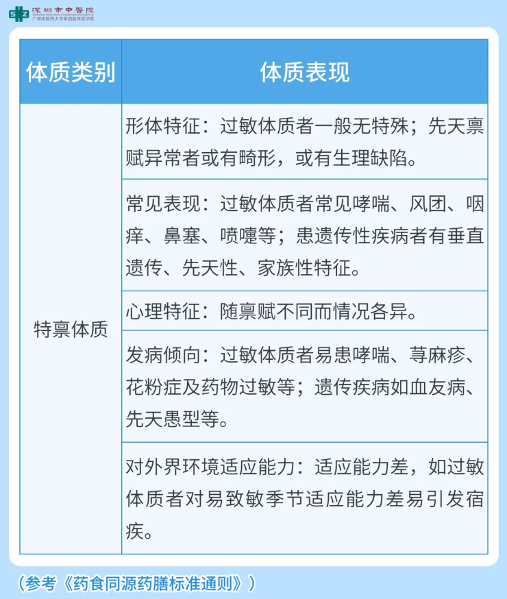 特禀质,顾名思义,就是一类体质特殊的人群。主要由先天性、遗传因素或者妊娠期间,胎儿受到不良影响造成的一种体质缺陷;此外,后天失于调养,机体出现的过敏性体质,如各种鼻炎、哮喘、肠炎、蛋白尿、紫癜、皮肤湿疹、荨麻疹等。在全国人群抽样调查里面,提示有2.5%的比例是特禀质,是九大体质类型中占比最低的一位。总占比虽然不高,但是在儿科、皮肤科这两个门诊,属于特禀体质的患者尤其多;人群中,儿童和青年较为常见。