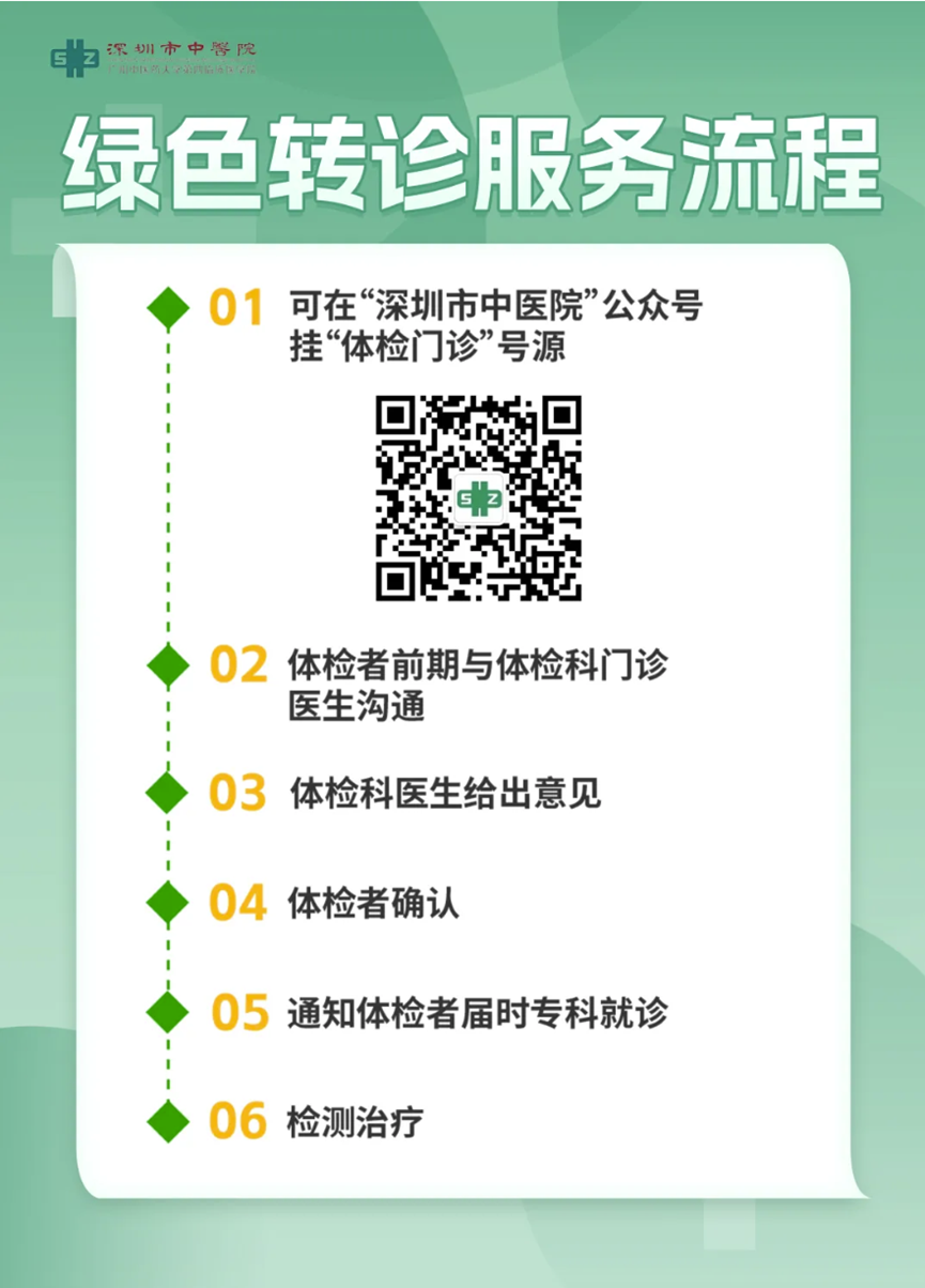 绿色转诊服务流程:可在“深圳市中医院”公众号挂“体检门诊”号源→体检者前期与体检科门诊医生沟通→体检科医生给出意见→体检者确认→通知体检者届时专科就诊→检测治疗