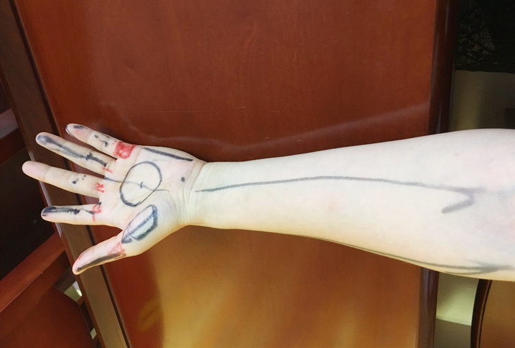 张海华主治医师为方便学员认知穴位,在自己的手上做穴位标注