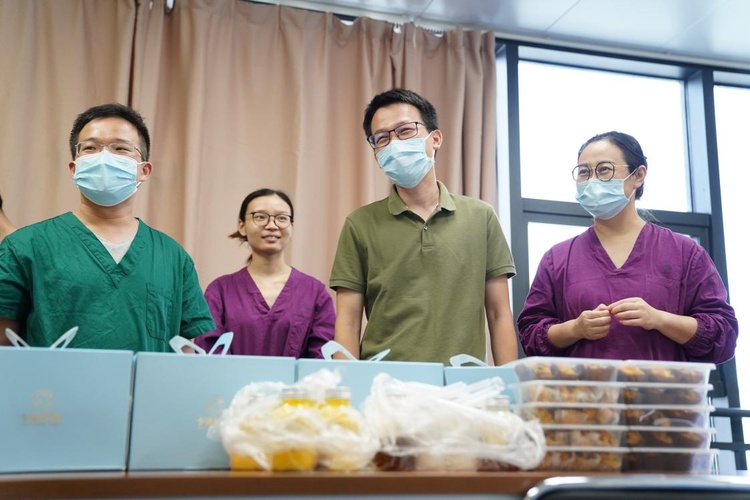 为了让更多的伙伴共同参与到本次美食慰问活动中,在现场发放活动结束后,医院又特别为在核酸采集点、发热门诊等地值班工作的同事们送去了点心。突然到来的惊喜引发了阵阵掌声,工作的疲惫似乎也在感动与喜悦中逐渐褪去。