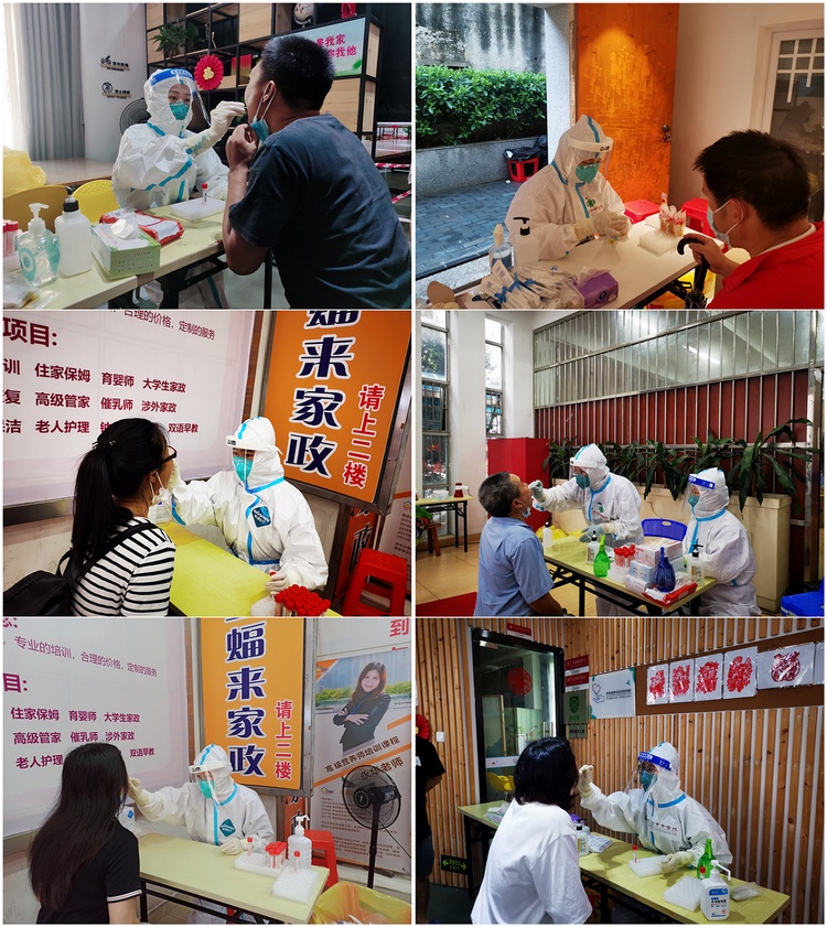 由于时间紧迫,在行车途中,张黎群主任、王太芬护长以“以老带新”的方式将队员迅速组队,将有实战经验的老队员分派到各组。24名采样队员被分成四个小组分别前往布吉街道社区党群活动中心、一村老人活动中心、东心岭商业大厦、凌道扬故居4个采样点开展核酸采样工作。