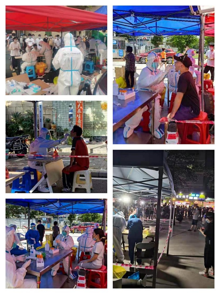 2021年6月18日,在上级部门的整体调度下,深圳市中医院迅速组织31名医护人员支援福永街道一线核酸采样。作为521疫情以来深圳的第一个中风险区域,支援该地核酸采样的任务风险更高,任务更紧。在深圳市中医院采样队到达时,福永街道已进入只进不出的严格管控状态,等待检测的队伍浩浩荡荡排起长龙。
