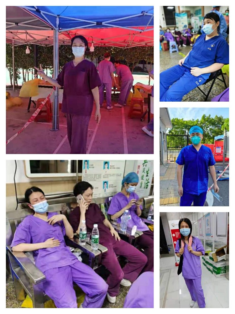 皮肤科文焕琛护士也是采样队中的一员。队员们总是亲切地称她一声文姐。70年出生的她已年过50。在高温之下,从采样岗位上退下来之后,文姐一直有些想吐,也会感到眩晕。她是深圳本地人。她的弟弟刚好是当天采样的社区工作站的工作人员,当天上午在工作站看到文姐在现场吃饭时还不敢认,后来打电话才知道真是自己的姐姐。下午他又到社康安排工作,正好看到文姐摊在座位上休息,见到文姐辛苦的样子,心理很难过,差点直接把她拉回家。文姐却说,我没事,缓缓就好,队员们还在等我接班。弟弟二话没说就走了,在场的其他人以为弟弟是躲起来哭了,因为看着他眼睛红红的。谁知道过了一会,文姐弟弟却跑了回来,还带回来了好几条毛巾给我们的队员垫在背后,因为他看到队员们的衣服都湿透了......
