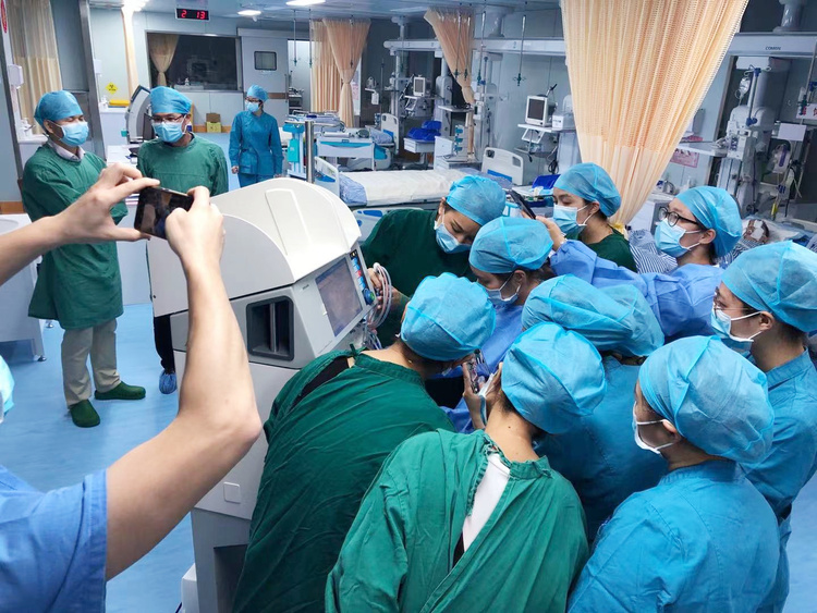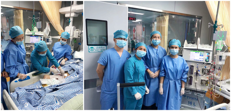 5月21日上午,按照前日计划,帮扶小组有序地对患者进行血管条件评估、制定血液净化治疗方案,韩钺医生带领该院重症医学科主任为患者进行穿刺置管,聂琴琪护士长及奉玉兰主管护师带领该科室护士进行治疗前准备:备机-装管-管路预冲。随着患者股静脉穿刺管的成功留置、引血顺畅,龙川县中医院首例床边血液净化治疗技术成功开展。床旁血液净化技术是重症医学不可或缺的重要组成,此例床旁血液净化技术的开展,填补了龙川县中医院该项目的空白,也使得龙川中医院重症医学科向着完善、强大迈出了坚实的一步。