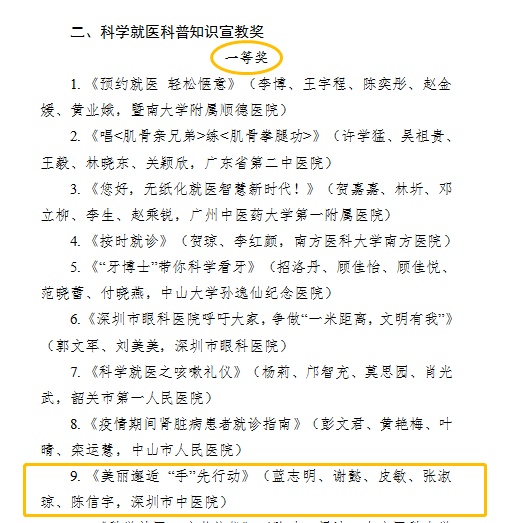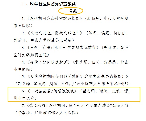 近日,广东省卫生健康委 广东省中医药局公布了2021年科学就医公众宣教作品征集大赛获奖个人和集体名单。在全省21个地市796位投稿人共计1275件(其中图文类作品687件,视频类作品588件)投稿作品中,深圳市中医院投稿作品《一起苗苗苗≠随意浪浪浪》、《美丽邂逅 “手”先行动》获科学就医科普知识宣教奖一等奖!