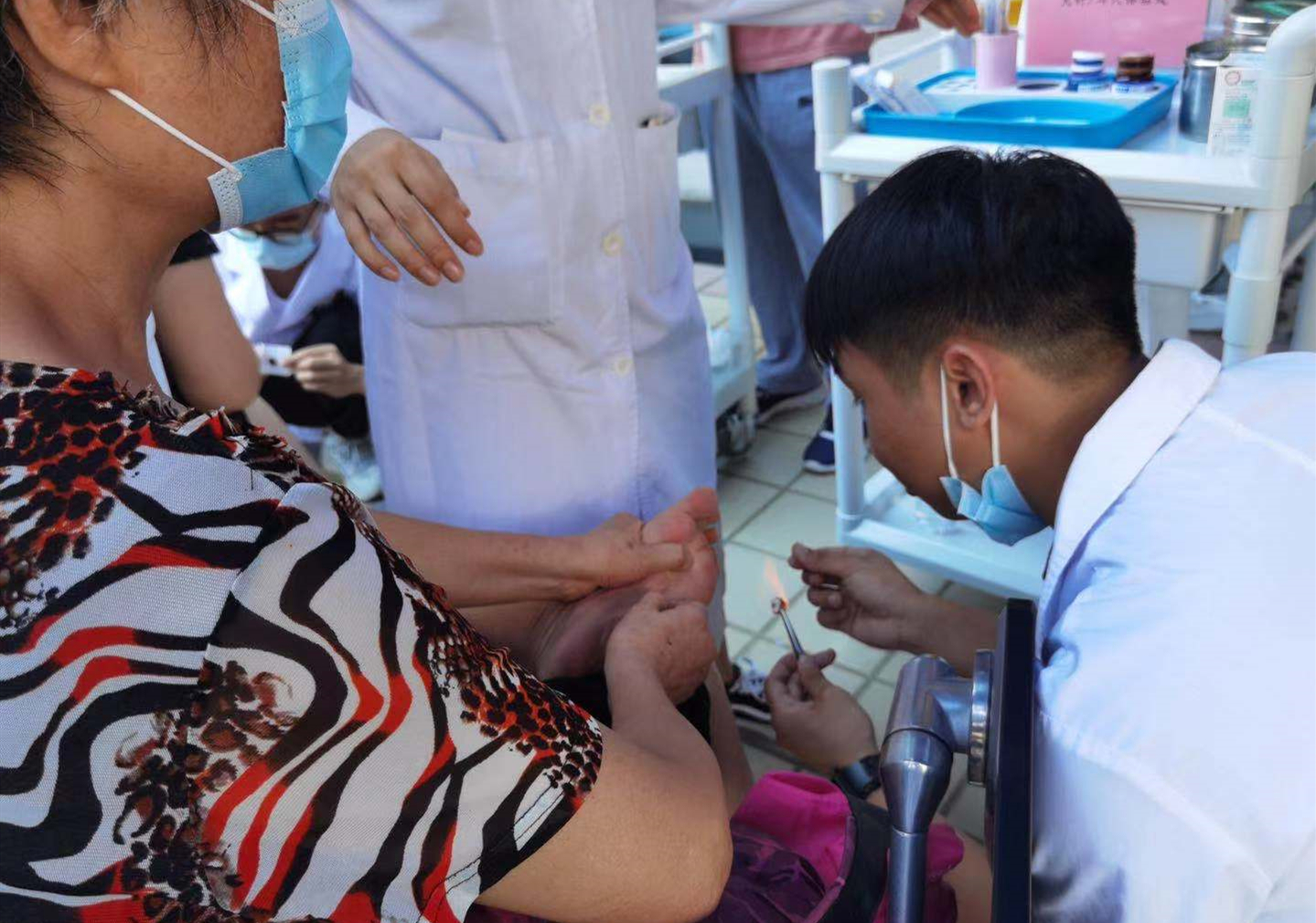 图为关节炎患者体验“毫火针疗法”