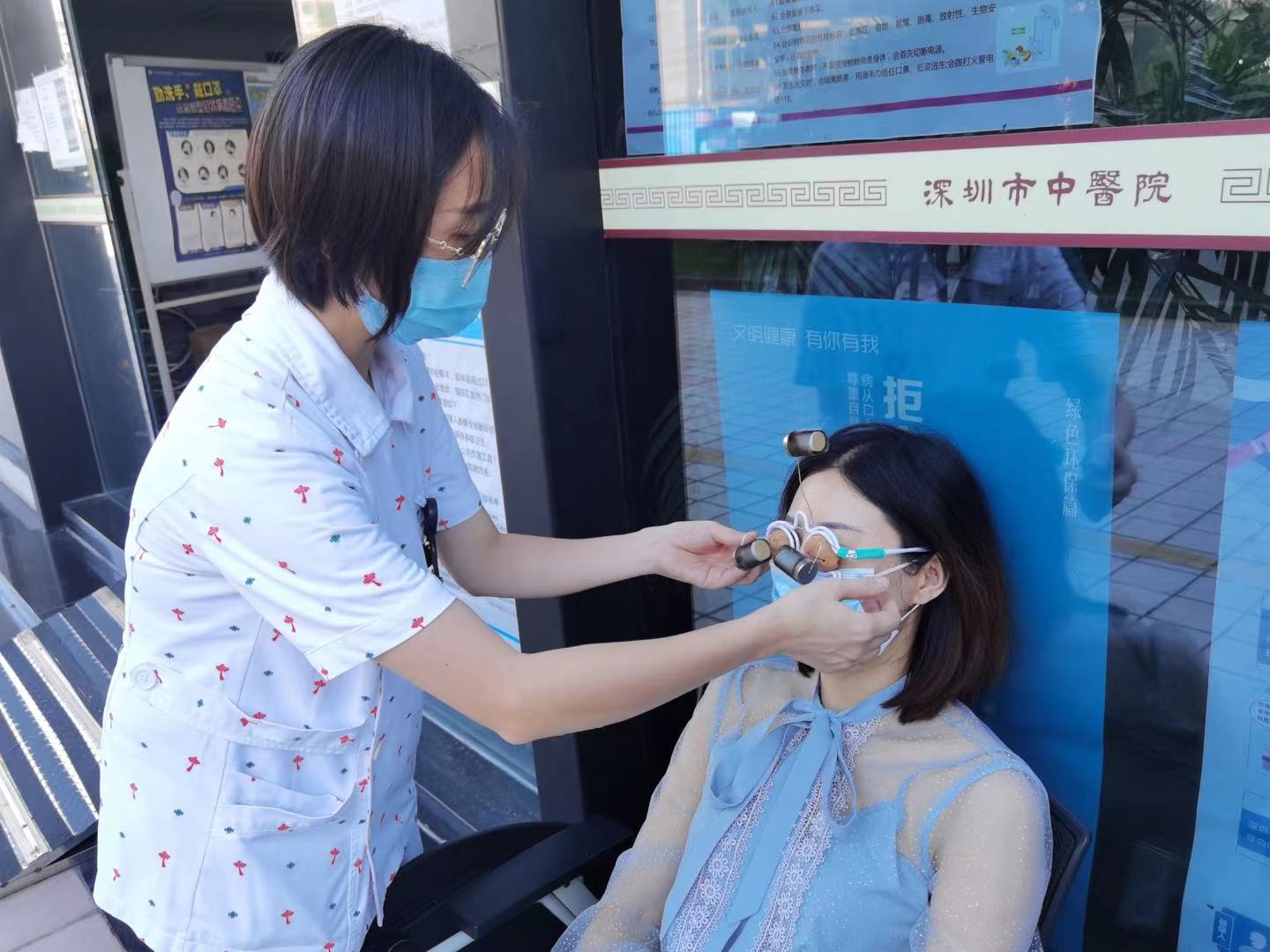图为视力衰退患者体验“核桃灸疗法”