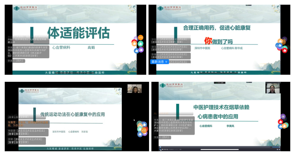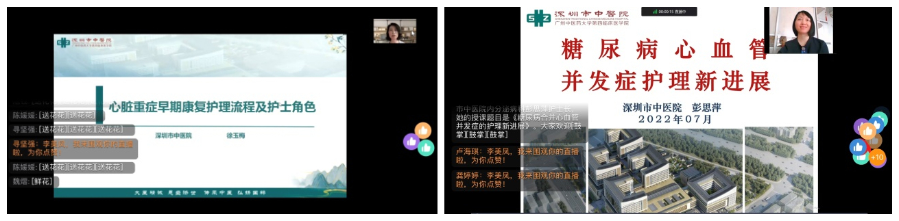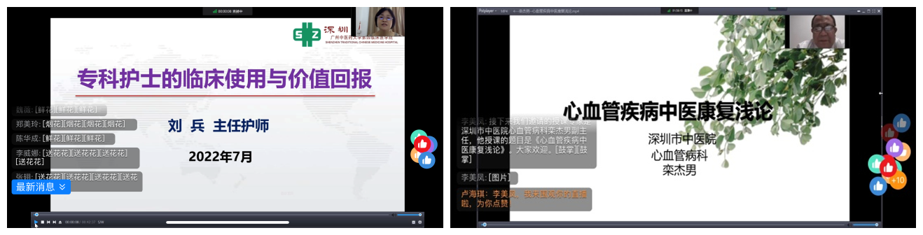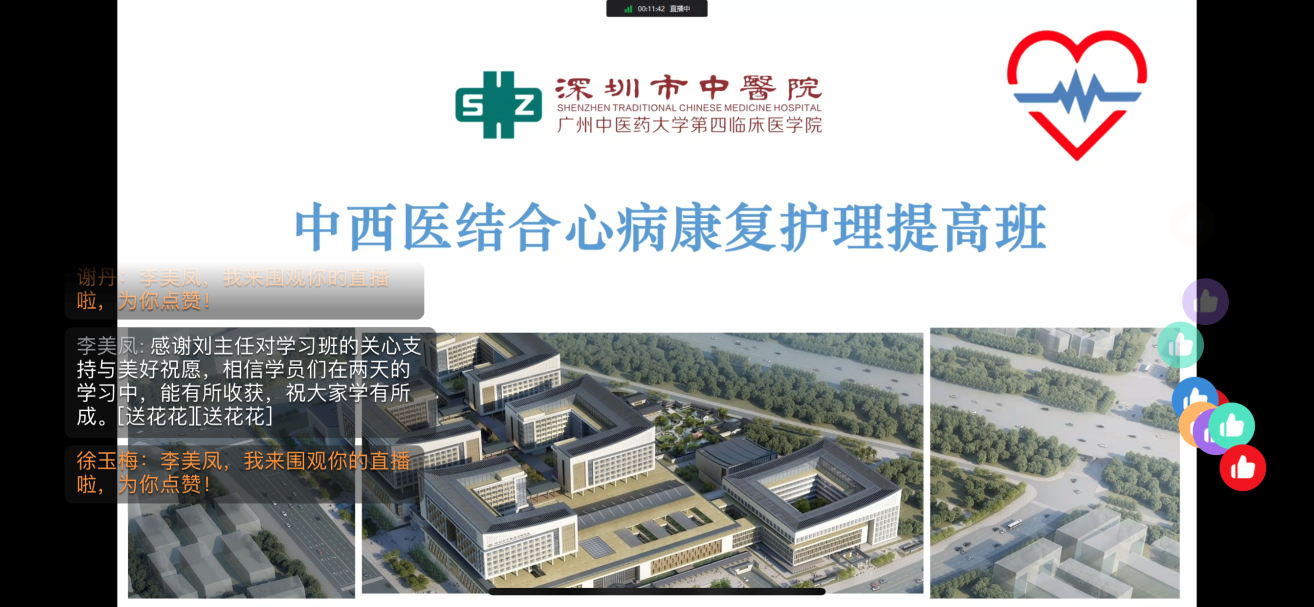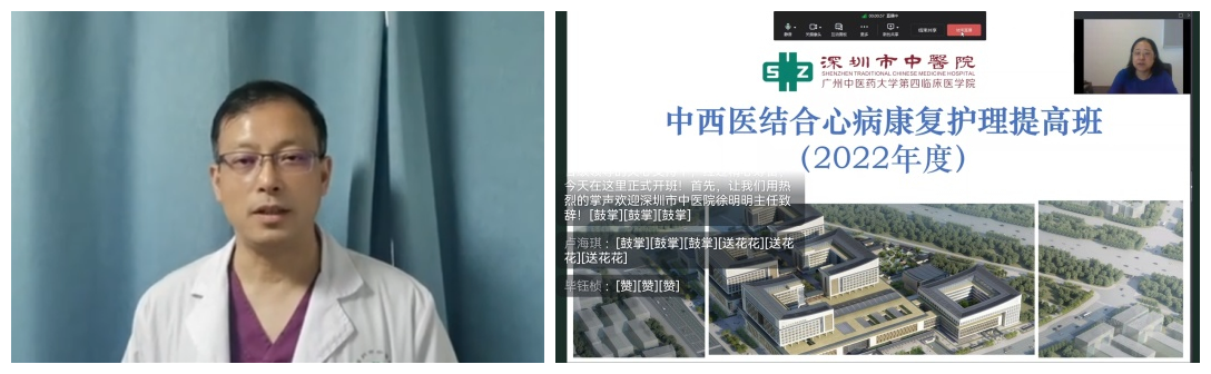 深圳市中医院心血管病科是国家冠状动脉功能学诊疗中心,是深圳地区率先开展冠脉介入治疗技术的中医心血管专科,并通过“中国国家胸痛中心”认证。为推动、探讨中西医结合护理在心脏康复中的应用,充分发挥中医药在心病治疗、康复中的优势,进一步推动中医心血管护理事业的发展,7月17日至18日,心血管病科护理团队举办的“深圳市级继续教育项目《中西医结合心病康复护理提高班:202205011》圆满落幕。本次提高班采取线上钉钉直播的方式,内容丰富精彩,受到广大学员欢迎。