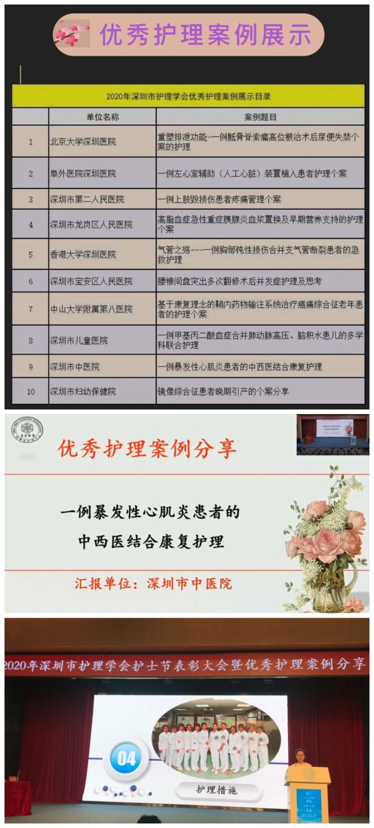 在第109个“5.12”国际护士节来临之际,深圳市护理学会举办了2020年精选案例论坛。通过院内选拔、市护理学会专家们评审,我院心血管病科的精选案例《一例暴发性心肌炎患者的中西医结合护理》脱颖而出,荣获“深圳市护理精选案例”评选二等奖。