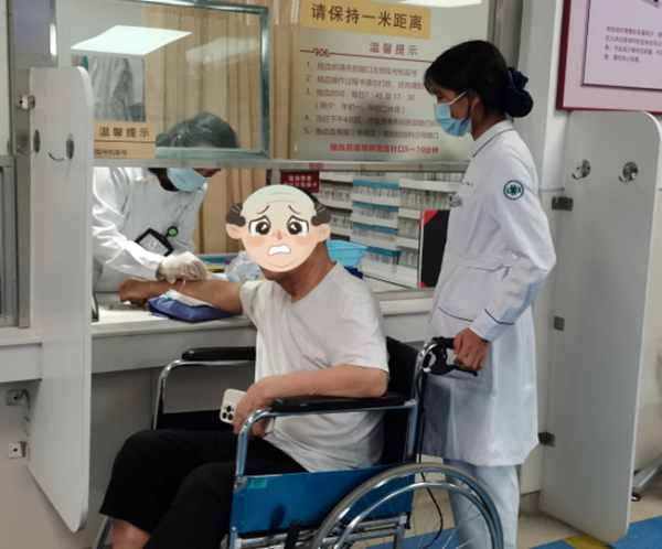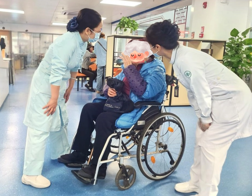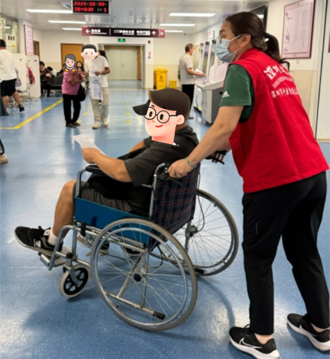 分诊护士和志愿者正在全程守护着行动不便的长者。涵盖入院手续办理、检验检查等环节,他们用细致与耐心,稳稳地陪伴长者走完就医的每一步。