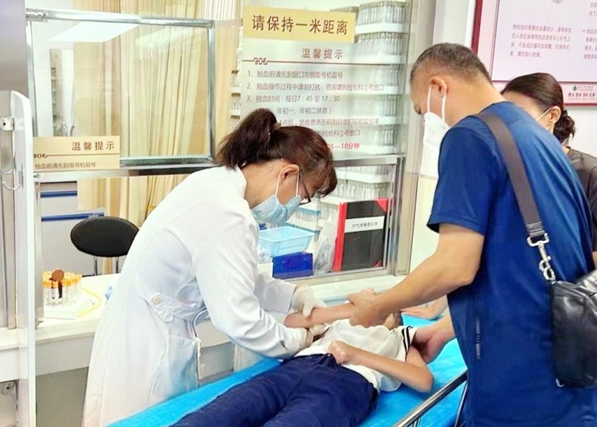 面对肌张力高、关节活动受限的小患儿,一次普通的采血也需要特别的呵护。抽血窗口的护士来到患儿身旁,俯身熟练完成采血,并柔声安慰,缓解了孩子的恐惧。