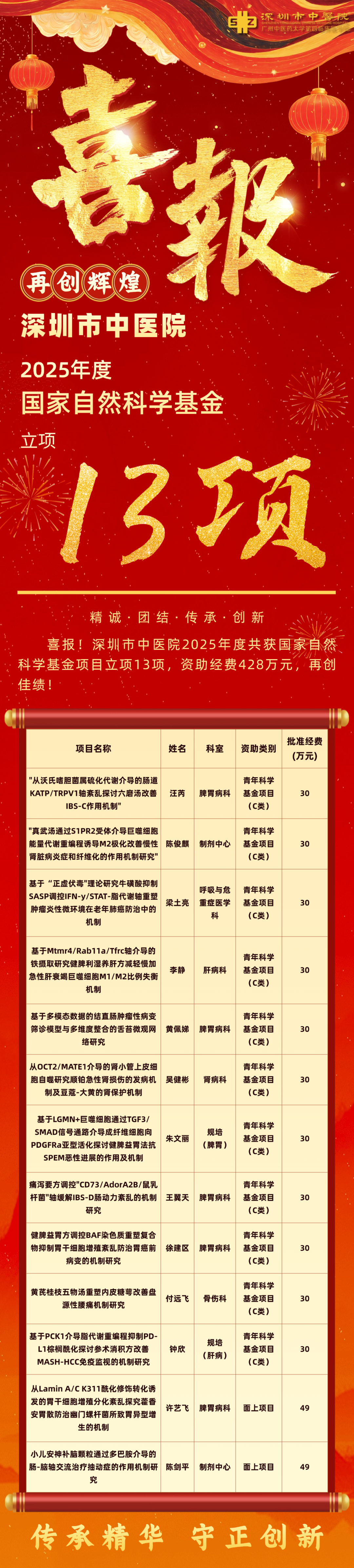 喜报!深圳市中医院2025年度共获13项国家自然科学基金立项!