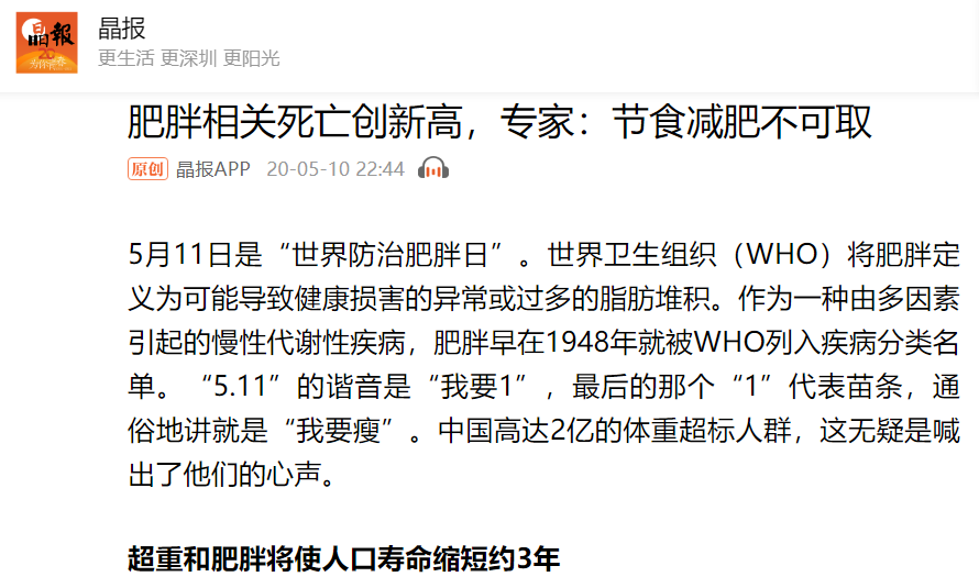 5月11日是“世界防治肥胖日”。世界卫生组织(WHO)将肥胖定义为可能导致健康损害的异常或过多的脂肪堆积。作为一种由多因素引起的慢性代谢性疾病,肥胖早在1948年就被WHO列入疾病分类名单(ICD编码E66)。“5.11”的谐音是“我要1”,最后的那个“1”代表苗条,通俗地讲就是“我要瘦”。面对中国高达2亿的体重超标人群,这无疑是喊出了我们的心声。