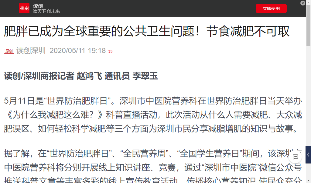 5月11日是“世界防治肥胖日”。深圳市中医院营养科在世界防治肥胖日当天举办《为什么我减肥这么难?》科普直播活动,此次活动从什么人需要减肥、大众减肥误区、如何轻松科学减肥等三个方面为深圳市民分享减脂增肌的知识与故事。