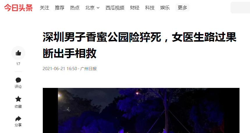 6月20日晚,深圳香蜜公园一男子突然倒地,不省人事,呼吸心跳均已停止,情况十分危急。