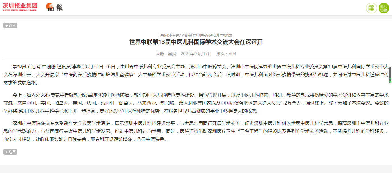晶报讯(记者 严珊珊 通讯员 李璇)8月13日-16日,由世界中联儿科专业委员会主办,深圳市中医药学会、深圳市中医院承办的世界中联儿科专业委员会第13届中医儿科国际学术交流大会在深圳召开。大会开展以“中医药在后疫情时期护佑儿童健康”为主题的学术交流活动,围绕当前及今后一段时期,中医儿科面对新冠疫情带来的挑战与机遇,共同研讨中医儿科适应时代需求的发展道路。