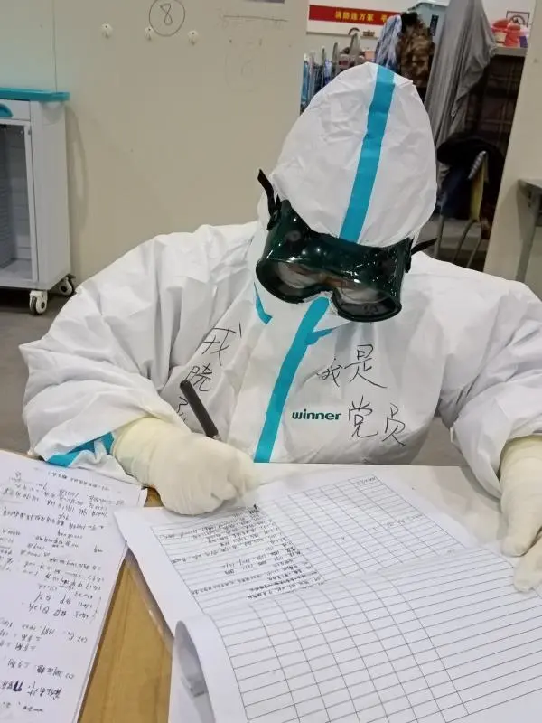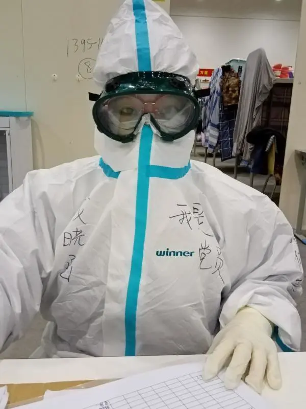 不知不觉,第一天组长班结束了。忽然,我感觉自己的脸碰到了防护服内侧,凉凉的。我心中一惊,怀疑自己是否职业暴露,赶紧去照镜子。镜子里的自己,依然被防护服保护得很好。我意识到,原来是我的汗水沾湿了防护服。