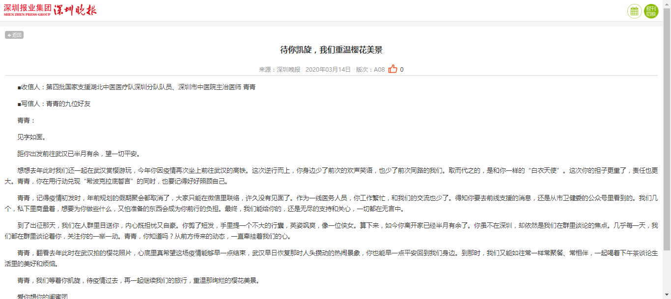 想想去年此时我们还一起在武汉赏樱游玩,今年你因疫情再次坐上前往武汉的高铁。这次逆行而上,你身边少了前次的欢声笑语,也少了前次同路的我们。取而代之的,是和你一样的“白衣天使”。这次你的担子更重了,责任也更大。青青,你在用行动兑现“希波克拉底誓言”的同时,也要记得好好照顾自己。