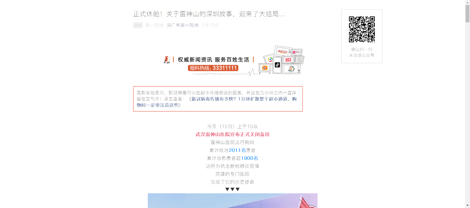 今天(15日)上午10点武汉雷神山医院宣布正式关闭备用