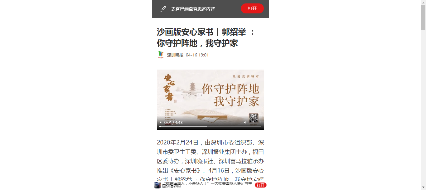 2020年2月24日,由深圳市委组织部、深圳市委卫生工委、深圳报业集团主办,福田区委协办,深圳晚报社、深圳喜马拉雅承办推出《安心家书》。4月16日,沙画版安心家书︱郭绍举 :你守护阵地,我守护家暖心上线,让我们一起领略独特艺术所展现的医者仁心。